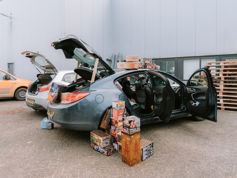Eén voor één verschijnen glunderende klanten met gigantische kartonnen dozen vol vuurwerk. Kofferruimtes, achterbanken en voetruimtes worden tot de laatste centimeter opgevuld. Na een vriendelijke ‘prettige jaarwisseling’ verdwijnen ze weer de stad in.